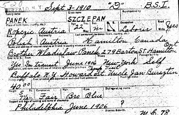 It appears that the John "Jan" and brother Joseph "Josef" Bursztyn immigrated to the America before any of the Paneks did. There is cross border documentation that reads that Walter, Stanley and Stephen all used their contacts Uncle Jan or Uncle Josef Bursztyn in their cross boarder movements. See Docs below.
